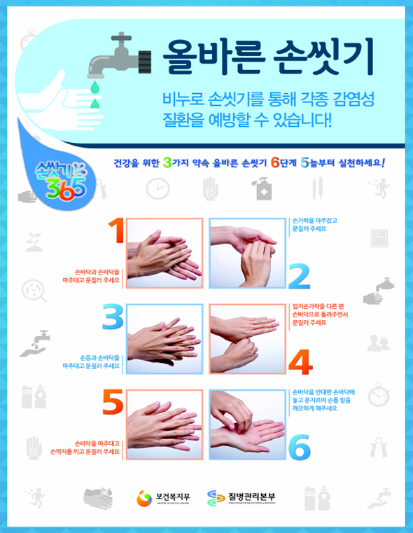 - 외출 후, 배변 후, 식사 전후 비누로 30초 이상 손 씻기