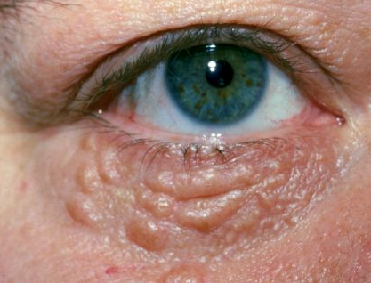 주로 눈 주위, 뺨, 이마, 목 등에 나타나며, 더운 여름철이나 땀이 많을 때 더 두드러져 보일 수 있습니다. 피부색 또는 약간 붉은 색을 띠며, 통증이나 가려움은 보통 동반하지 않습니다.