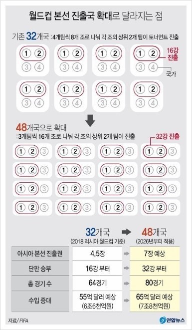 FIFA는 2026년 월드컵이 사상 처음으로 현재 32개 팀에서 확대해 48개 팀이 참가한다고 발표했습니다. 토너먼트에는 16개 팀이 더 참가하지만 팀이 플레이해야 하는 최대 총 경기 수는 변경되지 않습니다. 결승 진출자 2개국도 현재와 같은 총 7경기를 치르게 됩니다.