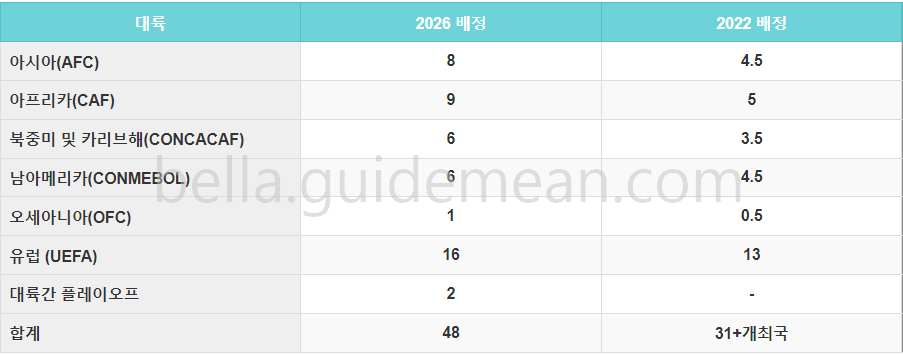 대륙간 플레이오프의 경우 유럽을 제외한 5개의 대륙과 개최국 대륙의 1개국으로 총 6개국이 개최지에서 대륙별 미니 토니먼트로 펼쳐져 이곳에서 상위 2개국이 월드컵에 진출하게 된다고 합니다.